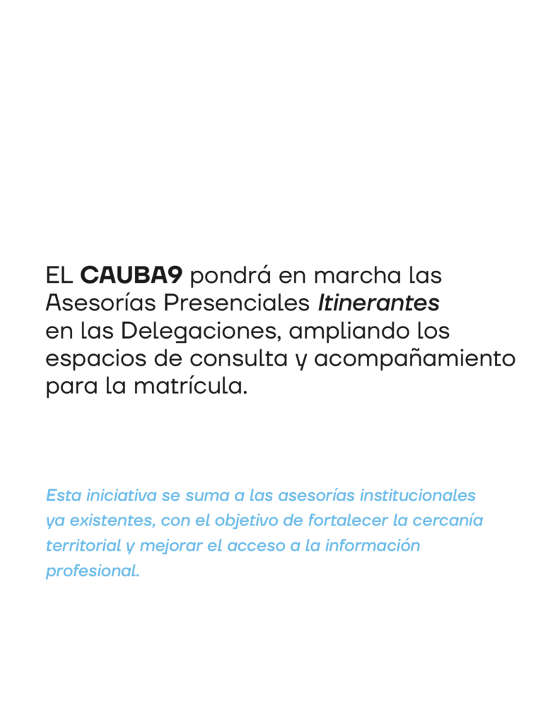 El Colegio de Arquitectura y Urbanismo de la Provincia de Buenos Aires – Distrito 9 (CAUBA9) informa que, a partir del mes de abril de 2026, se pondrán en marcha las Asesorías Presenciales Itinerantes en Delegaciones, ampliando los espacios de consulta y acompañamiento para la matrícula.