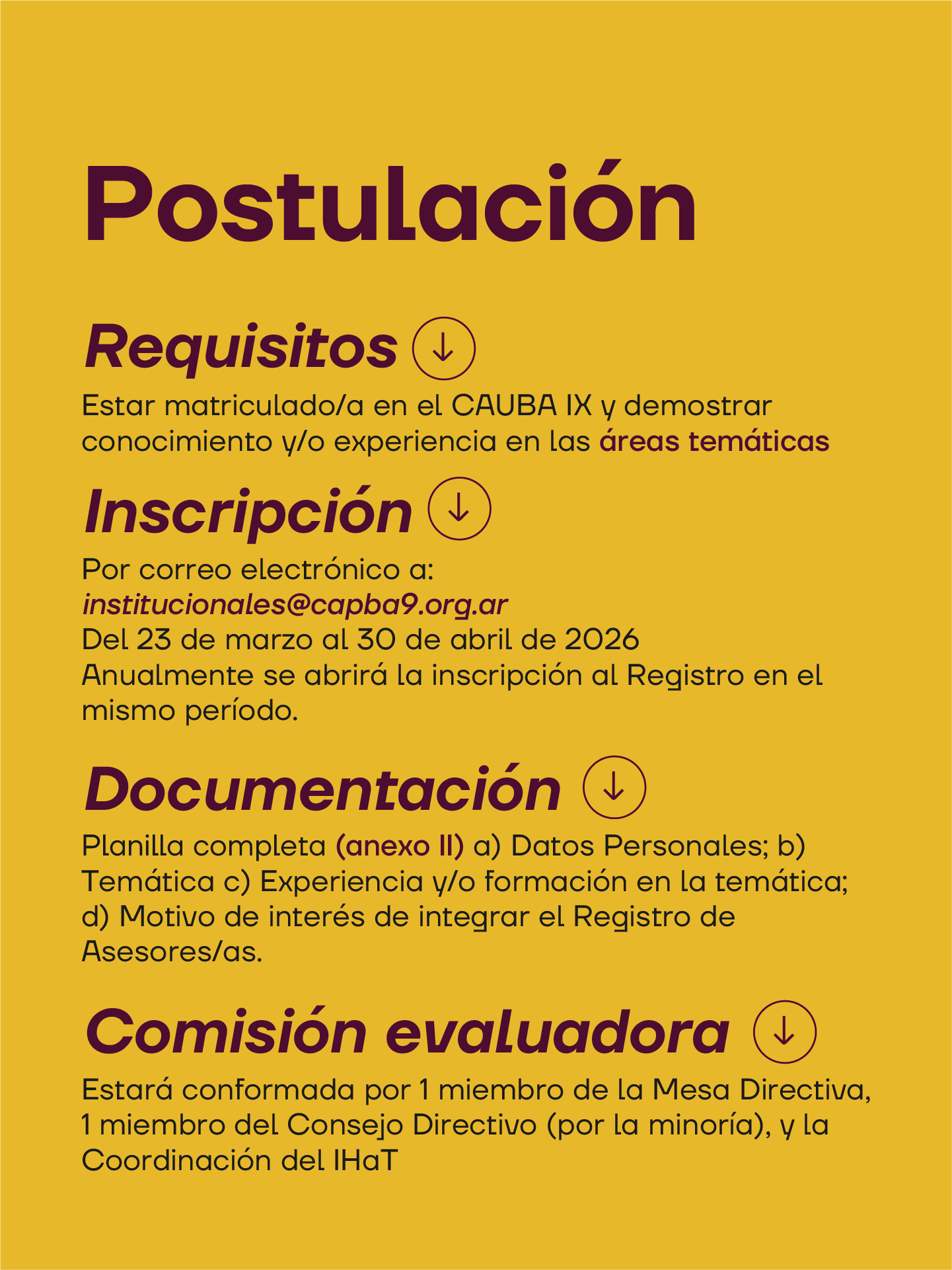 Las postulaciones deberán enviarse por correo electrónico a institucionales@capba9.org.ar, adjuntando la planilla de inscripción y la documentación requerida.