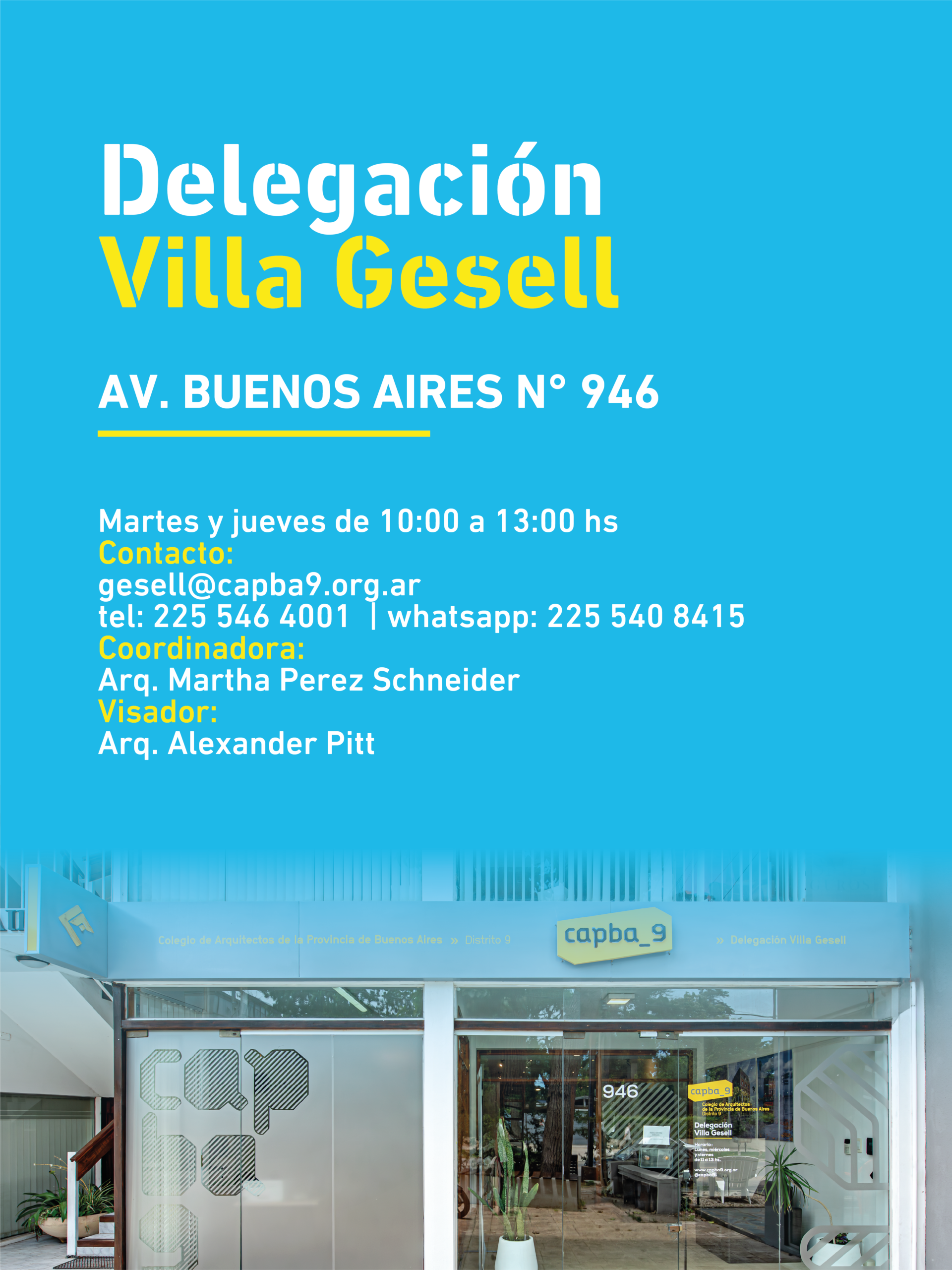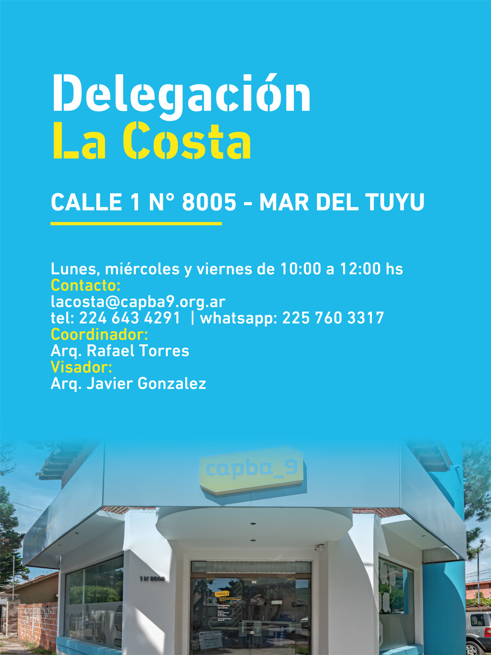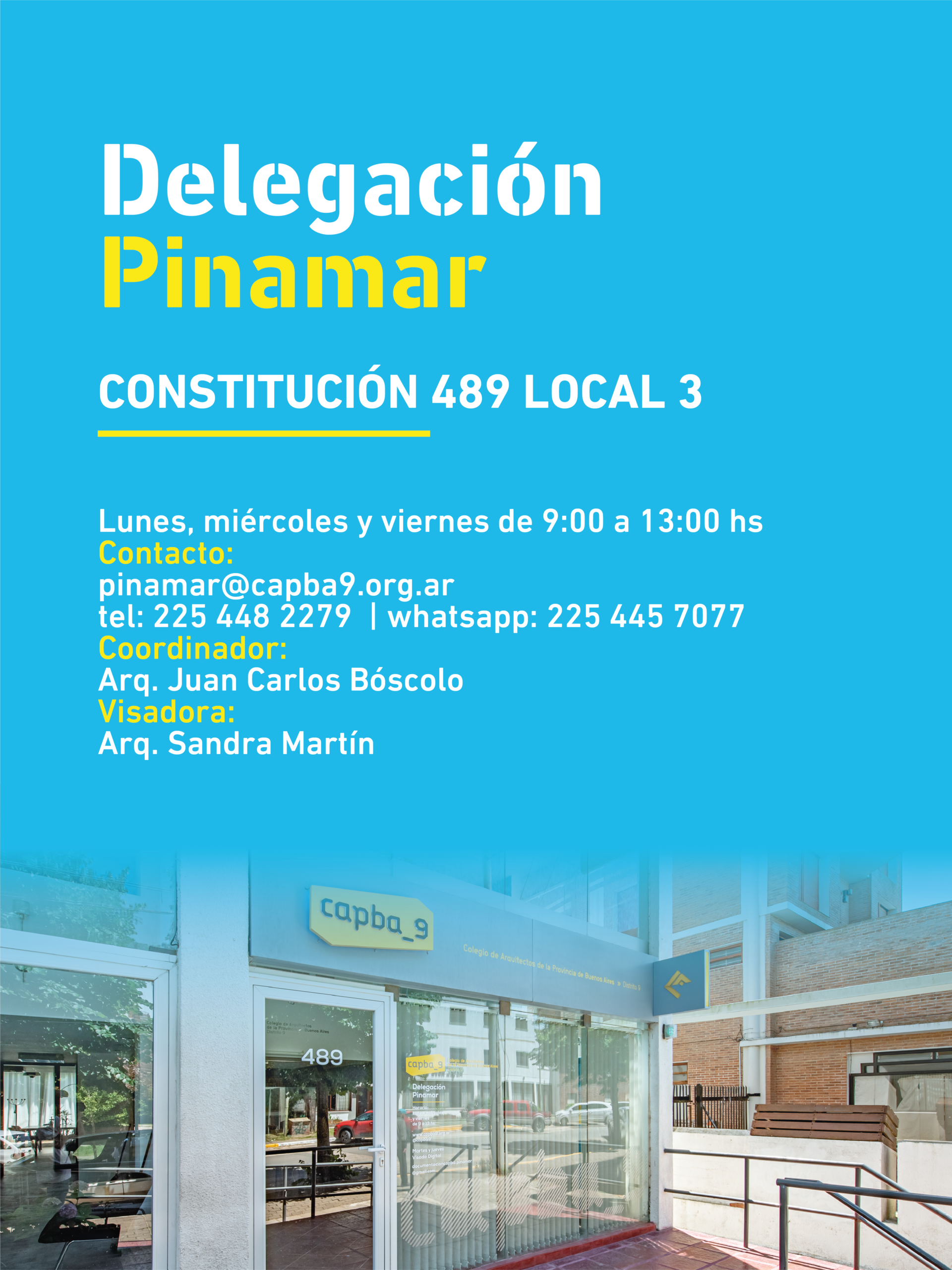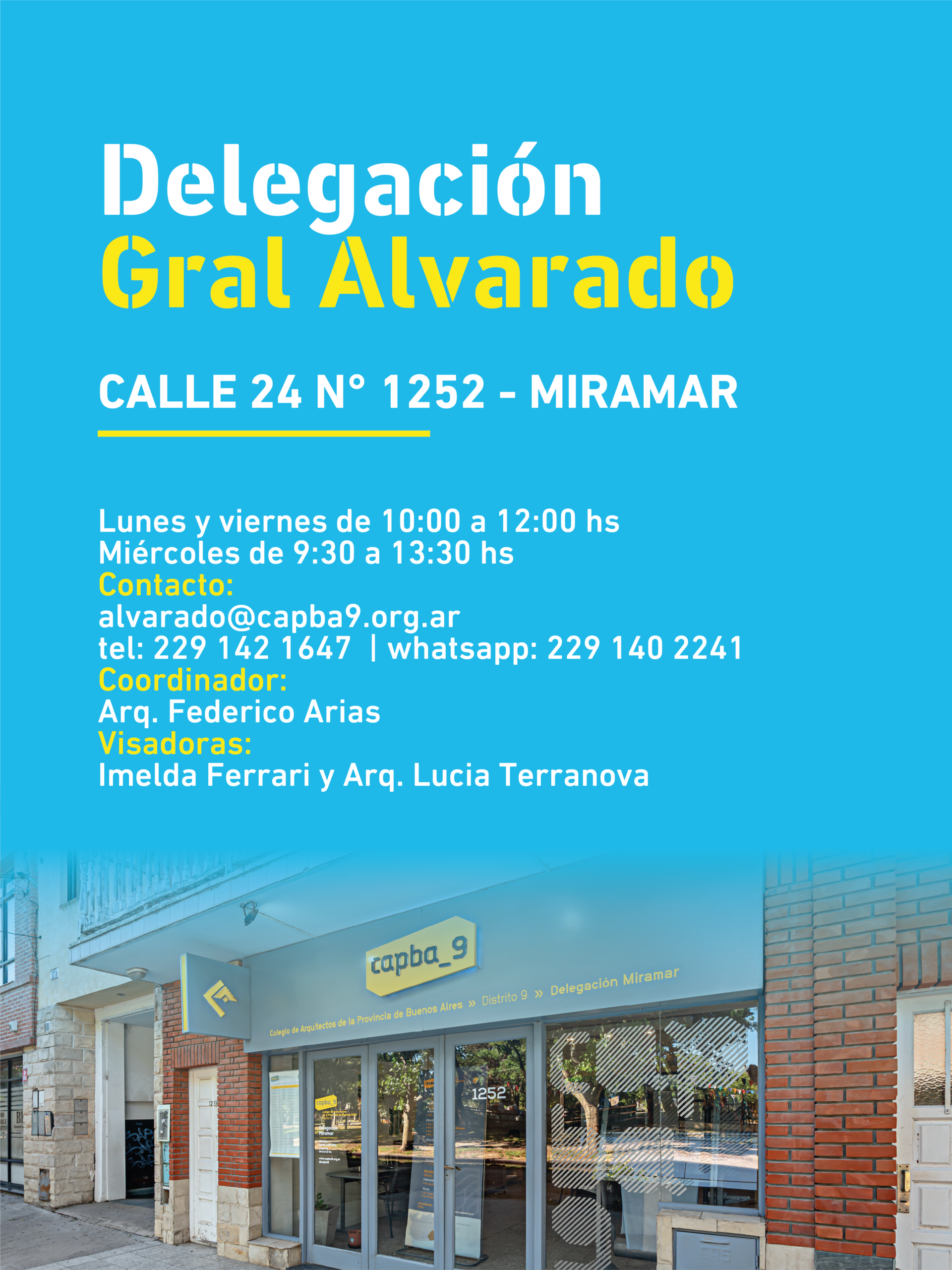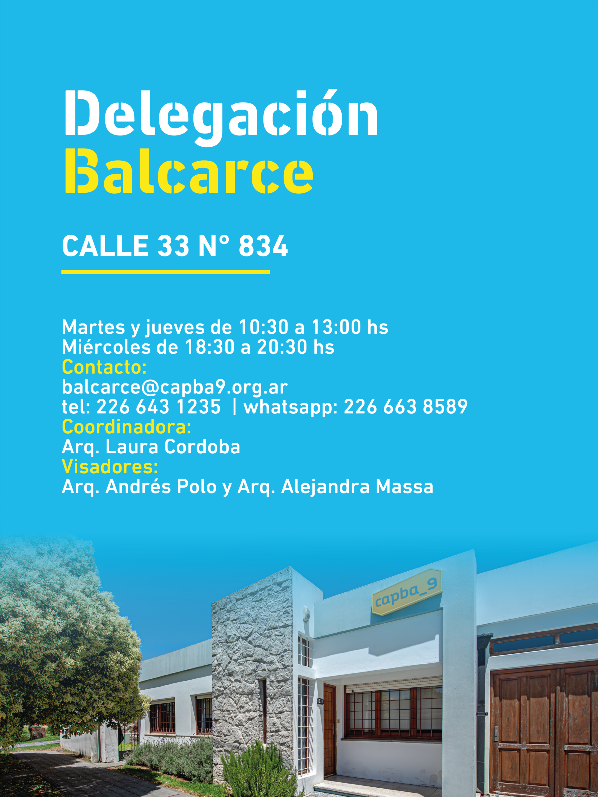 El Colegio de Arquitectos de la Provincia de Buenos Aires – Distrito 9 informa los medios de atención y contacto de sus delegaciones y subdelegaciones, con el fin de facilitar la comunicación y el acceso a trámites y consultas en cada localidad del Distrito.