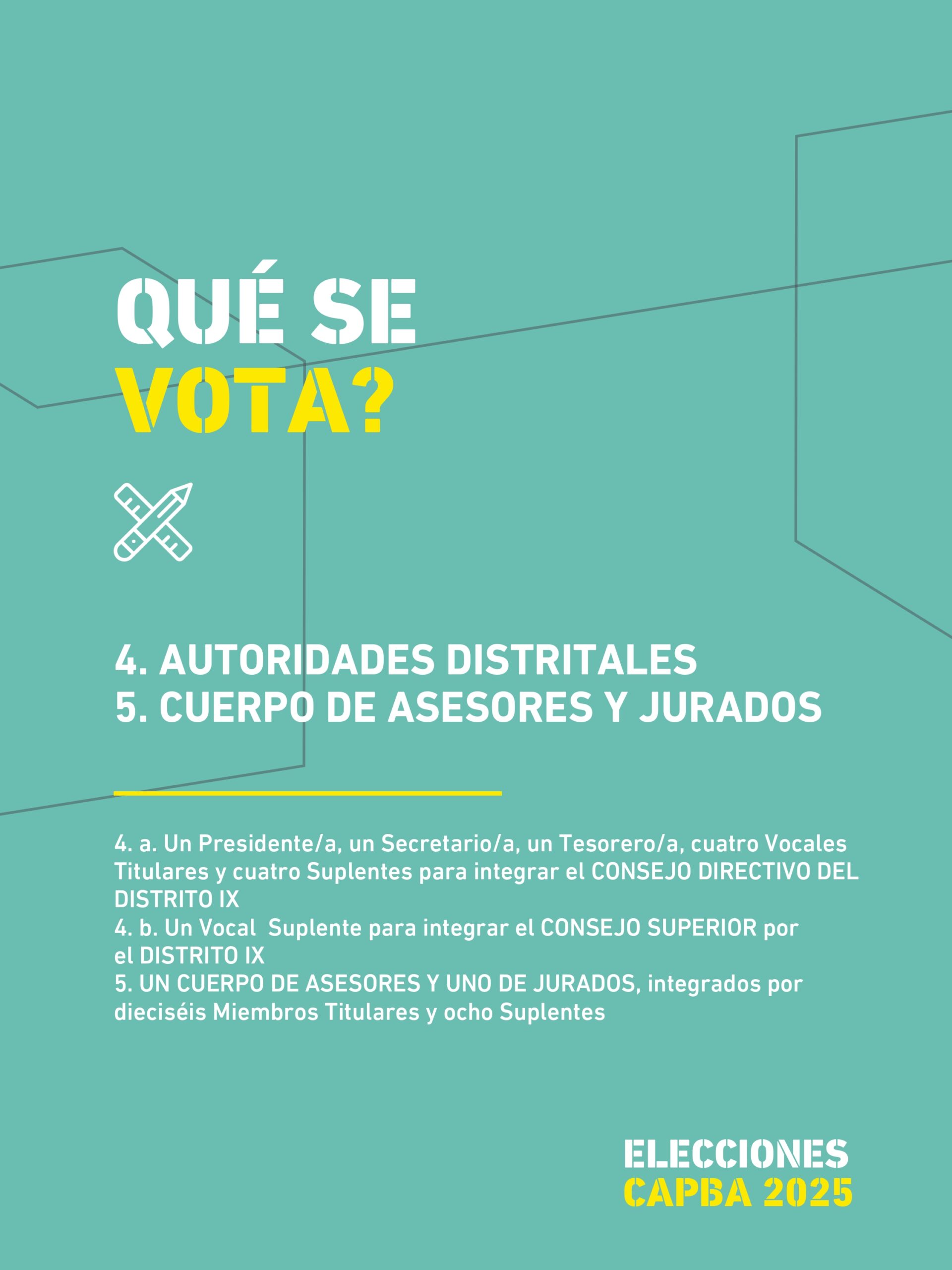 Asimismo, se designarán cuatro Vocales Titulares y cuatro Suplentes que completarán el Consejo Directivo Distrital, integrados de forma proporcional a los votos obtenidos por las distintas listas.