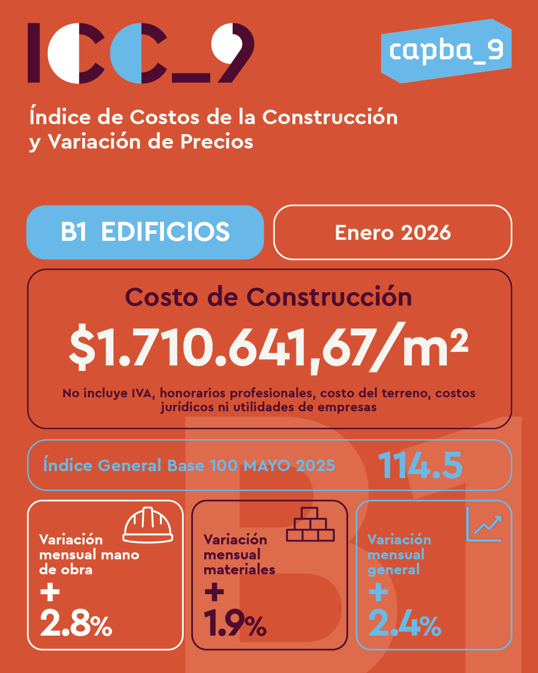 Con esta variación, el costo de construcción en el Distrito IX se ubicó en $1.710.641,67 por metro cuadrado, sin incluir IVA, honorarios profesionales, costo del terreno, costos jurídicos ni utilidades de empresa.