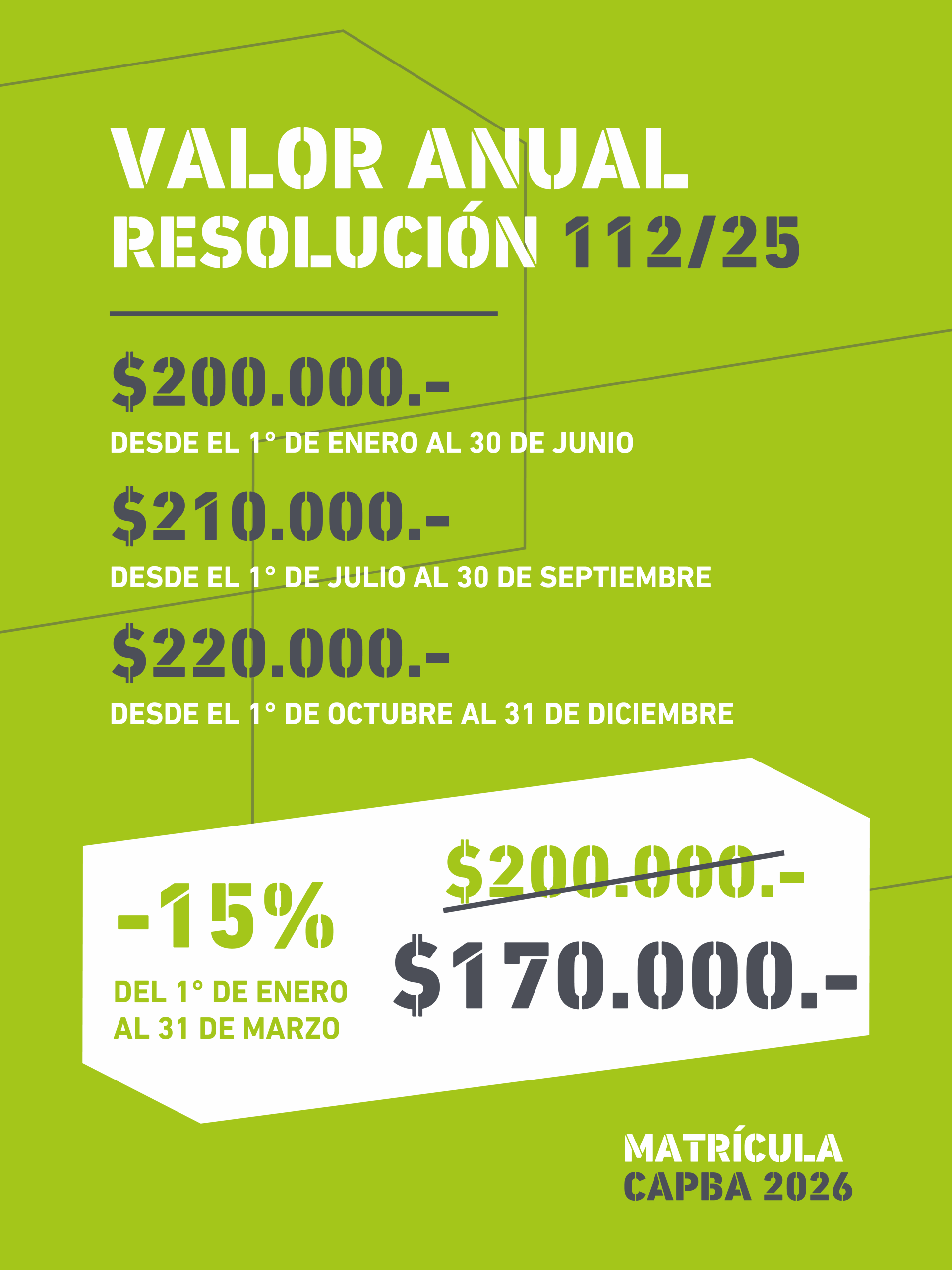 Los valores de la matrícula anual obligatoria, a partir del 1° de enero de 2026, conforme a la resolución 112/25 se ajustan a la siguiente escala de acuerdo a la fecha del efectivo pago: