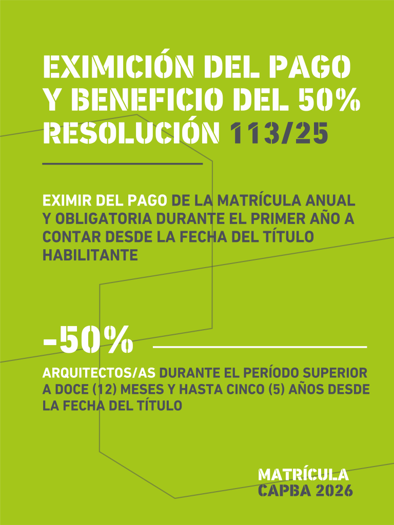 Otorgar el beneficio de pago del 50% de la Matricula anual y obligatoria a aquellos/as arquitectos/as durante el período superior a doce (12) meses y hasta cinco (5) años desde la fecha del título. El beneficio se extenderá desde la fecha de matriculación hasta que finalice el periodo mencionado, sobre el valor vigente a la fecha de pago, considerando los descuentos que rijan.