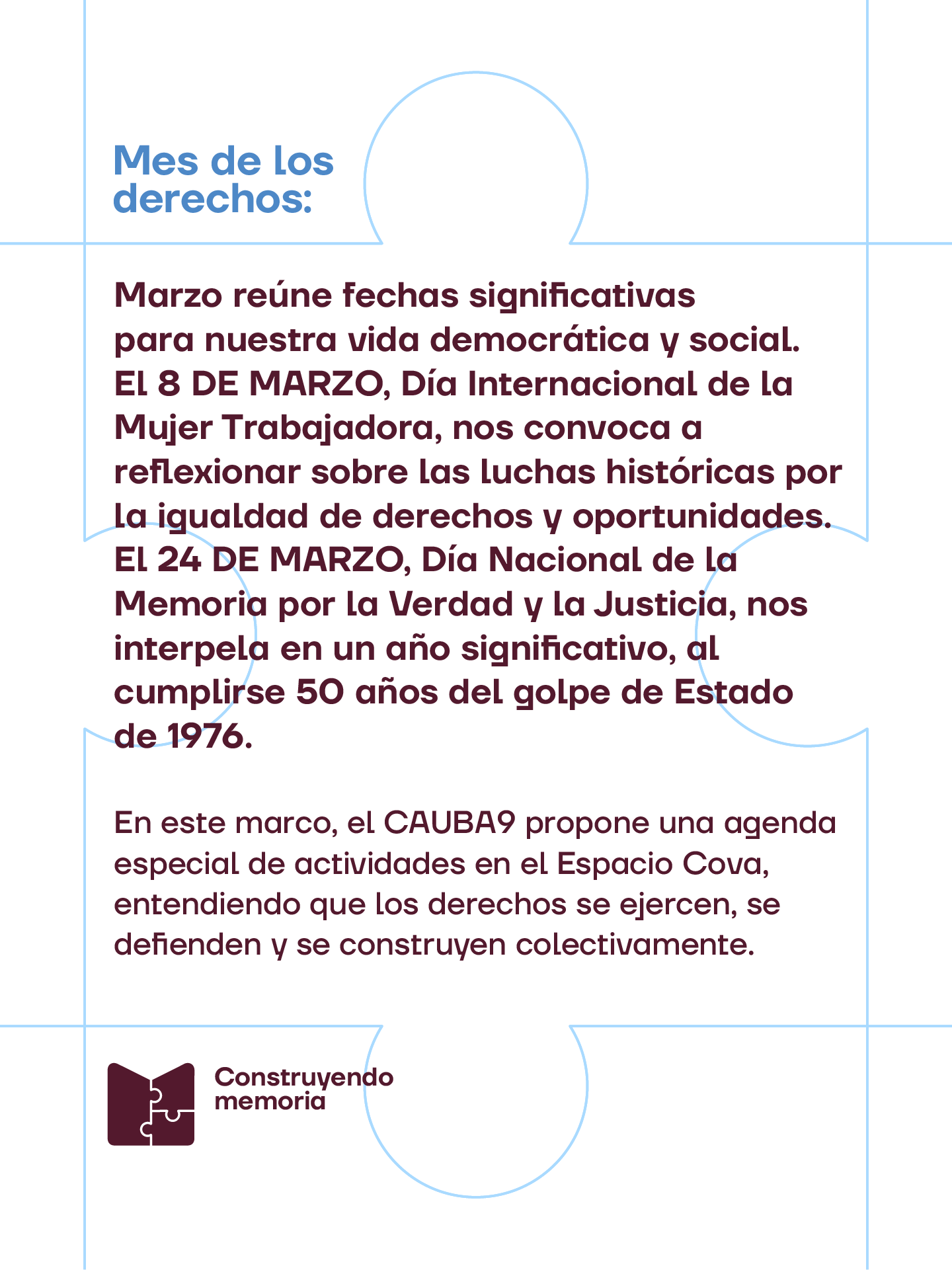 En este marco, el Colegio de Arquitectura y Urbanismo de la Provincia de Buenos Aires – Distrito 9 (CAPBA9) presenta el Mes de los Derechos – Construyendo Memoria, una agenda de actividades abiertas que se desarrollarán en Espacio Cova (Funes 2146, Mar del Plata), con el objetivo de generar instancias de participación activa entre profesionales, instituciones y comunidad.